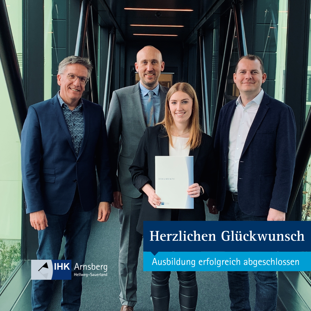 Nach ihrer erfolgreichen Schullaufbahn startete Hannah Franke im September 2020 ihre Ausbildung zur Kauffrau für Büromanagement bei der Industrie- und Handelskammer. Hier lernte sie in der folgenden Zeit vielfältige Aufgabenbereiche kennen, wie die Teilnahme an Karrieremessen, Unterstützung bei der Standortpolitik, Umwelt- und Klimafragen sowie die Begleitung der Dualen Studiengänge. Um die theoretischen Aspekte ihres Berufes zu vertiefen, besuchte sie das Berufskolleg Berliner-Platz in Neheim.